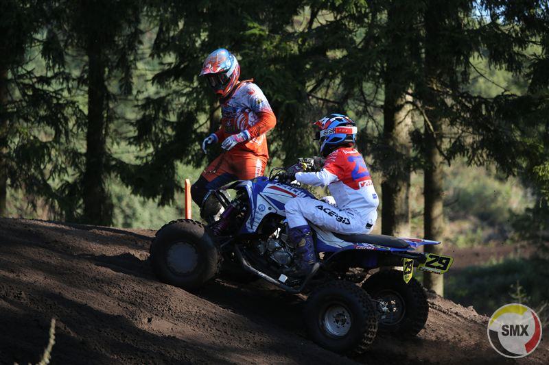 Onder een lekker herfstzonnetje gingen vanmiddag eerst de quads op pad voor hun eerste heat, waarin USA rijder Joel Hetrick op een vlotte zege leek af te stevenen , tot ie in de slotfase ten val kwam, en terugviel naar plek twaalf, waardoor team USA zich moest tevreden stellen met de tweede plaats van Bryce Ford, die zich vanaf de tweede startrij naar voor had gewerkt. De Noor Christopher Tveraen won de manche, voor Ford, en een sterke Julian Veldman. Helaas ging de tweede oranje man, Mike Verboven vroeg in de race kopje over, en reikte daarna niet verder meer dan plek zeventien. De Belgen deden het prima. Jurgen Nouwen startte als zesde, en viel in de slotfase wat terug naar plek tien. Dirk Schelfhout deed net het omgekeerde. Hij startte vanaf rij twee op plek twintig, en knokte zich naar voor naar plek elf.