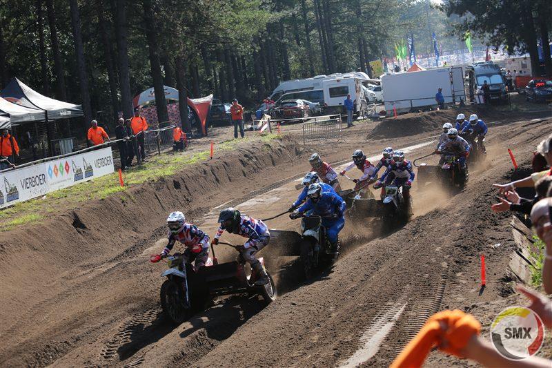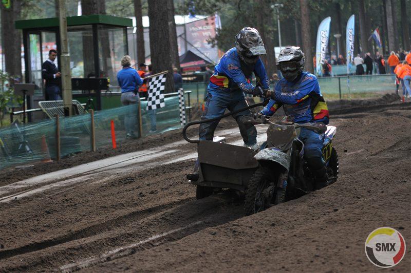 Bij de sidecars kregen we voor het eerst deze middag wereldkampioenen Hermans-van den Bogaart in actie, en dat die de wedstrijd met overmacht wonnen, zal wel niemand verbazen. De race begon met enkele verrassende wendingen, waarbij de Deens-Belgische combinatie Jensen-Vanhamel de kopstart pakte, maar na een kleine halve ronde jammer genoeg kopje over sloeg, waarbij co-piloot Vanhamel zich bezeerde aan de schouder. Hermans-vd Bogaart en Wijers-van Hal waren alras op de twee eerste posities te melden voor Wilkinson-Millard die aanklampten, en . . . de Italiaanse Lasagna broers die zwalpend en zuchtend al het mogelijke probeerden om zich te handhaven in het voor hen onbekende zware Hollandse zand. Sanders-de Veene raakten in de verdrukking in de start en gingen pas als elfde op pad. Teamgenoten Delmotte-Valcke begonnen er aan als dertiende