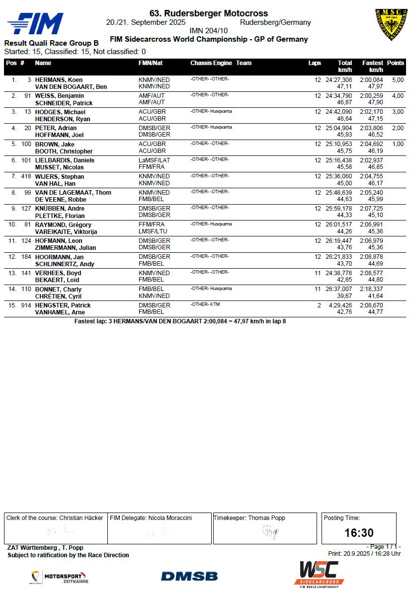 De hemel kleurde vervaarlijk grijs, maar het bleef gelukkig wel droog zodat we opnieuw perfecte omstandigheden kregen voor de start van reeks twee. De Engelsen Dan Foden en Michael Hodges namen opnieuw het initiatief en schoven voor de Pruniers, Hermans-vd Bogaart en Prümmer-Steegmans de eerste bochten in en uit. De Pruniers stootten al gauw door naar plek twee, gingen even prikken bij koplopers Foden-Weinmann, maar legden zich vrij vroeg neer bij het meesterschap van de vandaag onklopbare combinatie Foden-Weinmann. En zo ebde de spanning vrij vlug weg uit deze slotmanche van het WK. Foden en Weinmann reden foutloos naar de manchezege, maar konden wegens hun diskwalificatie van heat één, de Grand Prix niet winnen. Prunier reed een beetje futloos rond op plek twee, want ook hij kon de Grand Prix niet winnen, en kon geen wereldkampioen meer worden. En Hermans en van den Bogaart hielden op plek drie het zaakje lekker onder controle : Wereldtitel binnen met een gouden randje er bovenop : De dagzege in deze slot Grand Prix van Rudersberg. Wat wil een mens nog meer ?