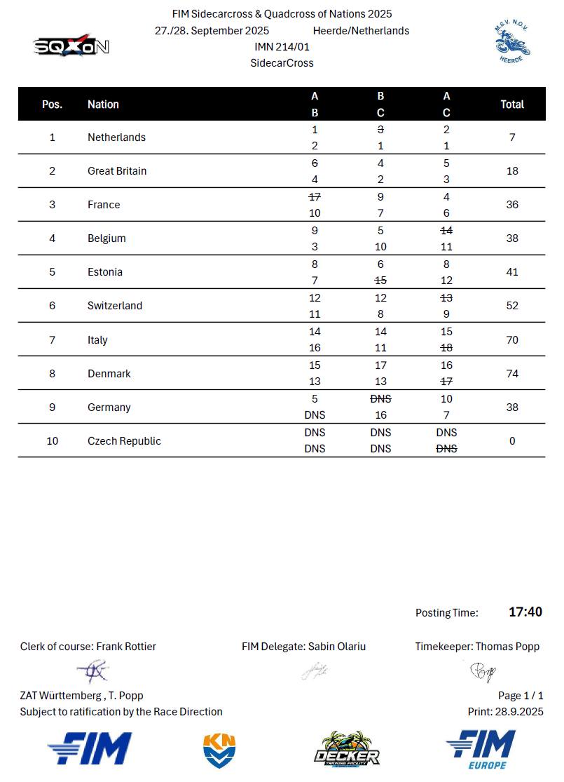 Met nog een ultieme wijziging bij de Britten - Stuart Brown,wiens co-piloot nog steeds niet geheel hersteld is van de crash in Vesoul , werd in extremis vervangen door Dan Foden – gingen vandaag de kwalificaties door van de Sidecarcross of Nations. Met ‘slechts’ tien aanwezige landen, zijn zo’n kwalificatieraces dan wat mager bezet, maar morgen wordt het alvast beter als er telkens twintig equipes per race de baan op gaan.