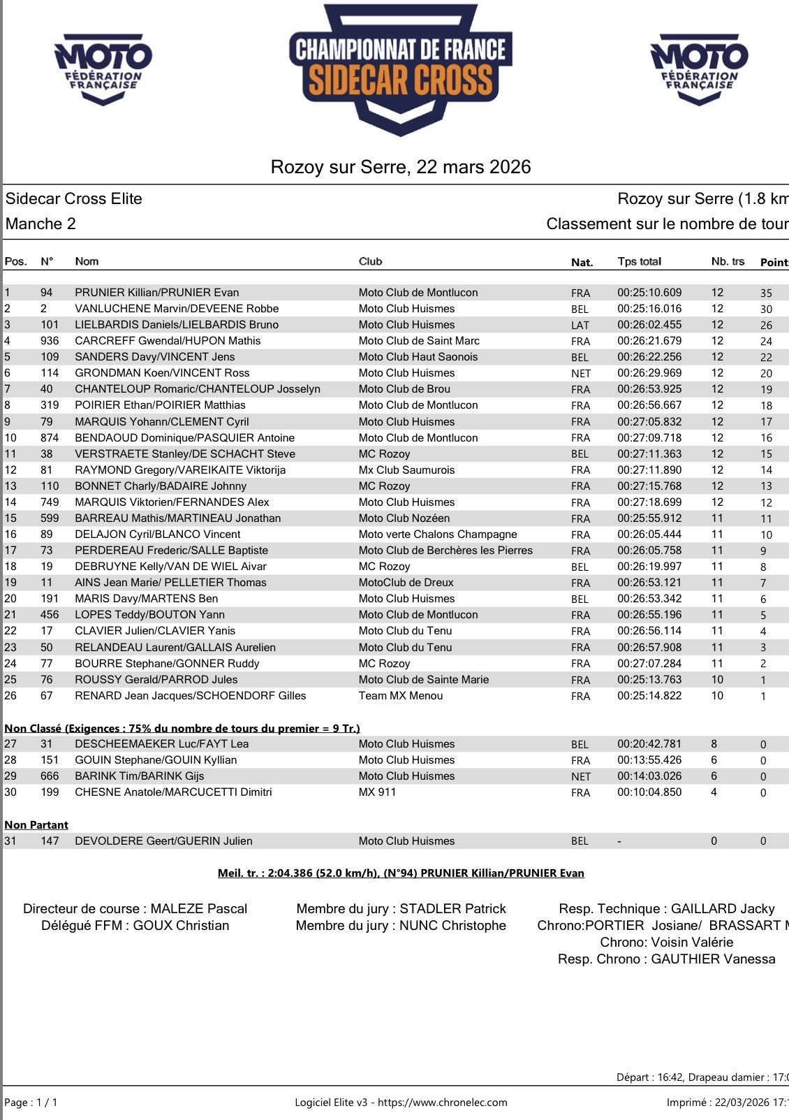 De affiche van de openingswedstrijd om het Frans kampioenschap zijspancross werd ietwat onthoofd door de afwezigheid van Hermans-Rietman (trainingsstage) en Foden-Weinmann (Dan Foden liep een dag eerder bij een onschuldige val tijdens een training een breuk op van de rechterpols en duim), maar er bleef gelukkig voldoende potentieel over om er een mooie sportnamiddag van te maken. MC Rozoy had zijn zaakjes goed voor elkaar, met uitzondering van de ellenlange rij voor wie hoopte ’s middags een frietje te stekken. Om maar te zeggen, dat het publiek in groten getale was komen opdagen in Noord Frankrijk. Zijspancross is nog steeds alive and kickin’ bij onze zuiderburen, en dat heeft natuurlijk veel te maken met het snelle rijden van local heros Killian en Evan Prunier, die ook na hun overstap van tweetakt op viertakt gisteren lieten blijken nog steeds onklopbaar te zijn in eigen land. Een trend die reeds een paar jaar aan de gang is, en waar het lokale Franse publiek telkens luidruchtig van smult.