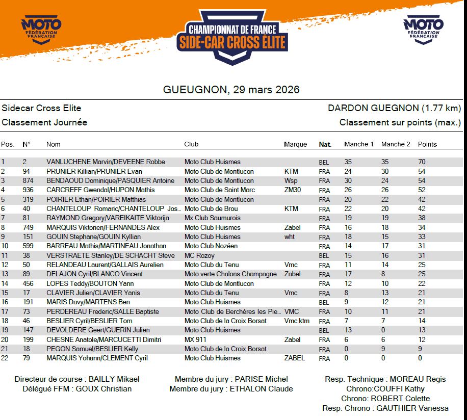 Komende zondag 22 maart gaat het Frans kampioenschap zijspancross van start, en dat lijkt al meteen een klapper van formaat te gaan worden met ‘un tres beau plateau’ zoals de Fransen een sterk deelnemersveld plegen te noemen. Voor de race in Rozoy-sur-Serre heeft praktisch de complete wereldtop zich aangemeld, wat duidelijk aangeeft dat de WK-koorts stilaan aan het stijgen is. De Franse broers Prunier maken reeds enkele jaren moeiteloos het mooie weer in eigen land, maar dit keer is de concurrentie voor hen op een Franse kampioenschapsrace van een nooit eerder gezien niveau. Wereldkampioen Koen Hermans en zijn nieuwe bijrijder Dion Rietman komen in Rozoy-sur-Serre hun harde banen-skills wat aanscherpen. Het Engels-Duitse koppel Foden-Weinmann, dé revelatie van het seizoenseinde vorig jaar, is eveneens van de partij. De Letse broers Lielbardis, nummer vier op de mondiale ranking vorig jaar, komen vanuit het verre oosten naar Noord-Frankrijk afgezakt. En ook drievoudig wereldkampioen Marvin Vanluchene, komt na bijna een jaar inactiviteit, met zijn nieuwe bijrijder Robbe de Veene competitieritme op doen. En met Davy Sanders en Jens Vincent heeft België zondag in Rozoy nog een tweede podiumkandidaat achter het starthek staan.