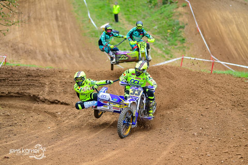 In reeks twee namen Willemsen-Bax revanche en wonnen met 25 seconden voorsprong op Van werven-van der Putten. Voor Santermans-Daiders werd het nog een spannende tweede koershelft. Gehinderd door een kapotte koppeling moest ‘Santi’ het wat rustiger aan doen, maar liep desondanks toch als derde binnen wat volstond voor de dagzege. Steegmans werd nu vijfde, voor regerend kampioen Andreas Clohse. De broers Janssens finishten twaalfde, Stan Goeyvaerts 15de. Bij Dierckens-Rostingt liet de ontsteking het afweten, bij het vallen van het starthek. Er werd in allerlei een andere ontsteking gemonteerd, maar tegen dan waren de anderen reeds drie ronden ver. Dierckens-Rostingt maakten van de nood een deugd, en maakten er dan maar een doorgedreven training van. Clohse-Haller (103 ptn) behouden de leiding in de DK-tussenstand voor Santermans-Daiders (95) en Weiss-Schneider (92). Maandag 1 mei wordt in Wrizen de vierde race om het Duits kampioenschap verreden. Op dezelfde dag vindt in Kamp Lintfort ook de jaarlijkse 1 mei internationale zijspancross plaats.