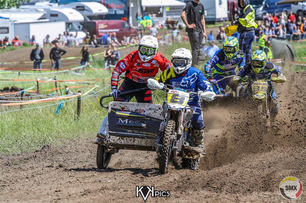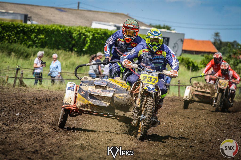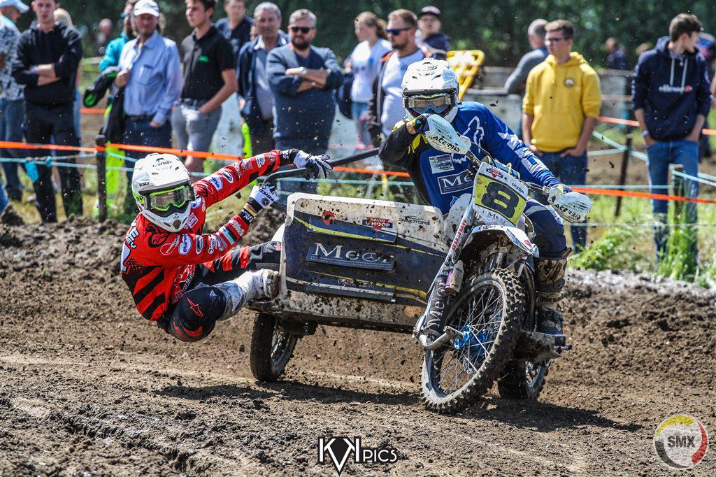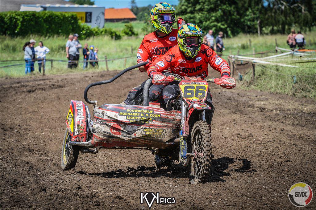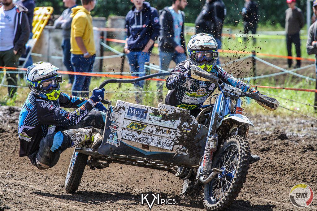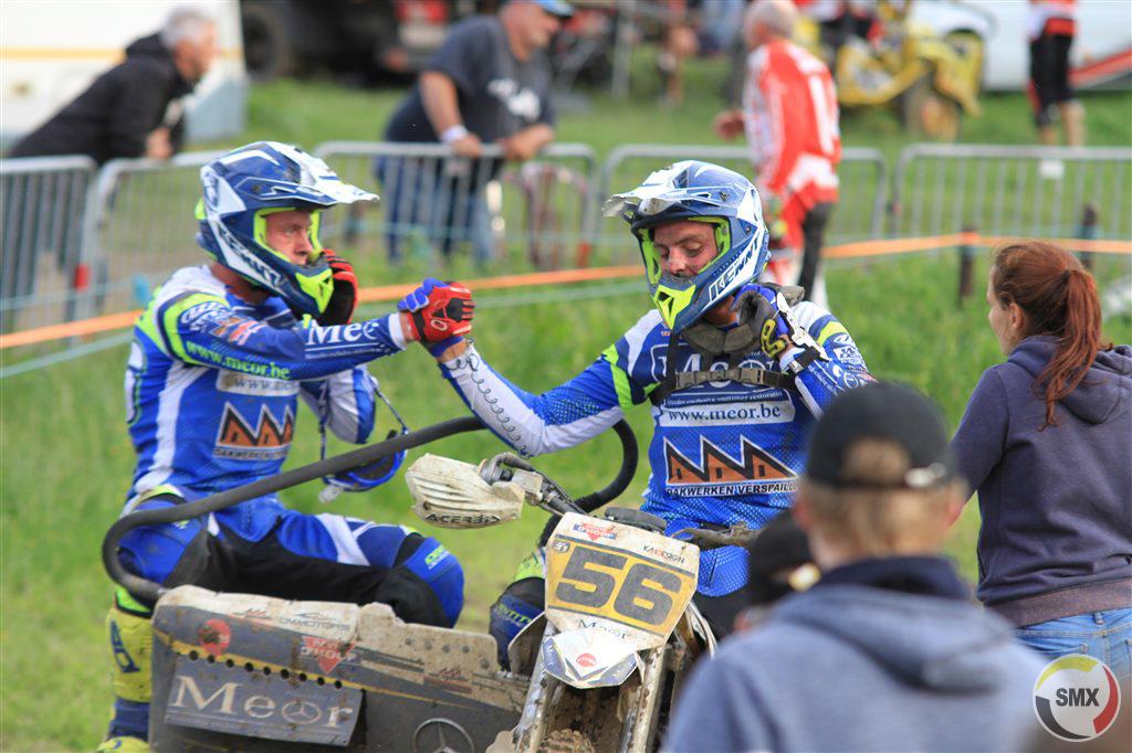 Reeks één was een kolfje naar de hand van de regerende kampioenen Bert Soetaert-Gianni Dhondt , die de handen vol hadden met Sven Siongers-Niels Wisselink die op karakter tweede werden. Kelly Debruyne-Jens Mans, komend van de tweede startrij, wonnen het spurtje om plek drie van Yens Delmotte-Tom Verbrugghe. Maxime van der Haeghen en Frederic Van der Voorden waren als vijfde eveneens in de spits van de wedstrijd te vinden, vlak voor Dylan Boussy-Steve de Schacht die onderweg een tweetal keer tot stilstand kwamen. Jan Ampe en Nzelo Hoste werden sterkste B-rijders op plaats tien. Sven Verbrugge, Ruben Galle, Daen Valcke , Nico de Soete en Kevin Merreel waren de bijzonderste pechvogels van dienst. Laatst genoemden zouden in heat twee niet meer aan het starthek verschijnen. In reeks twee konden kopstarters Boussy-de Schacht en Soetaert-Dhondt zich alras afscheiden van de rest van het peloton. Tot halfkoers klampten Soetaert-Dhondt vlot aan bij koplopers Boussy-de Schacht die er een strak tempo op na hielden en vlot op winst afstevenden. Bert Soetaert, met de zekere eindzege op zak, nam de tweede koershelft geen risico’s meer en koos op plaats twee eieren voor zijn geld. Kelly Debruyne had het opnieuw aan de stok met Yens Delmotte en in de aanvangsfase ook met Sven Siongers, omtrent plaats drie. Debruyne & Mans lieten zien de afgelopen maanden flink wat aan wedstrijdsnelheid te hebben opgebouwd en La Debruyne stond op drie flink haar mannetje en gaf haar plek niet meer af. Delmotte werd vierde, voor eerste B-rijders Valcke-de Veene die door een crash in heat één het dagpodium aan zich zagen voorbij gaan. De B-rijders beten overigens flink van zich af, want met Ampe-Hoste (dagwinnaars) op zes, de broers Moenaert op zeven en het damesduo Van Troys-De Soete op acht was het al B-geluid wat de klok sloeg. In de A-klasse waren de zegebloemen dus voor bijna thuisrijders Soetaert-Dhondt , met Kelly Debruyne en Jens Mans op twee. Derde man en ex MCLB-kampioen Dylan Boussy liet vooral in heat twee zien dat de samenwerking met Steve de Schacht in stijgende lijn gaat en het nieuwbakken koppel het hoogstwaarschijnlijk voor elkaar krijgt om zich klaar te stomen voor de Grand Prix van Markelo binnen drie weken. In de B-klasse hebben Jan Ampe en Nzelo Hoste de goeie flow beet, en zijn de jongste weken niet meer van het podium weg te slaan. Ampe en Hoste wonnen in Tielt, voor de broers Moenaert. Met het organiserende Tieltse meisjesteam Colleen van Troys en Jitske de Soete op plek drie werd ook in de B-klasse aangetoond dat zijspancrossen niet enkel en alleen meer een mannen aangelegenheid is. Onze Kay was uiteraard weer van de partij en keerde huiswaarts met een XXL zijspanfotogalerij van Tielt. Volgende week blijft MCLB in de provincie West-Vlaanderen en trekt naar Oostkamp.