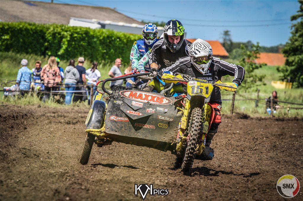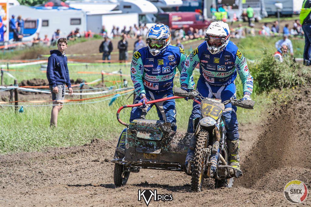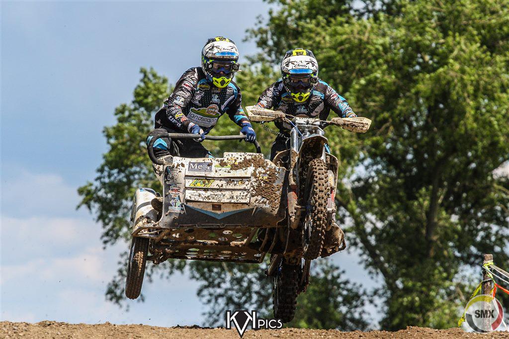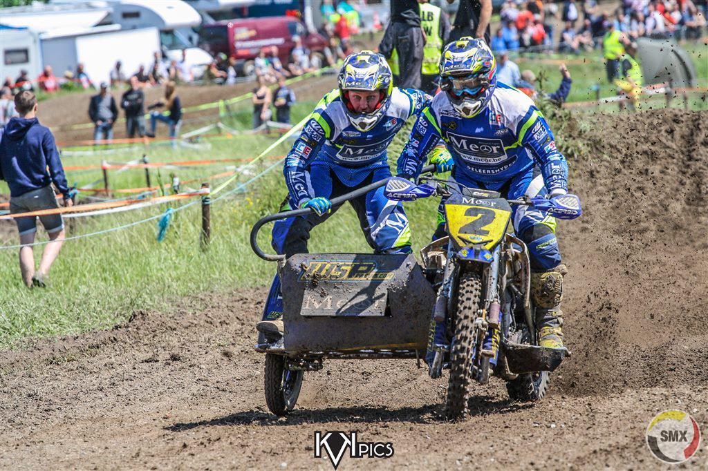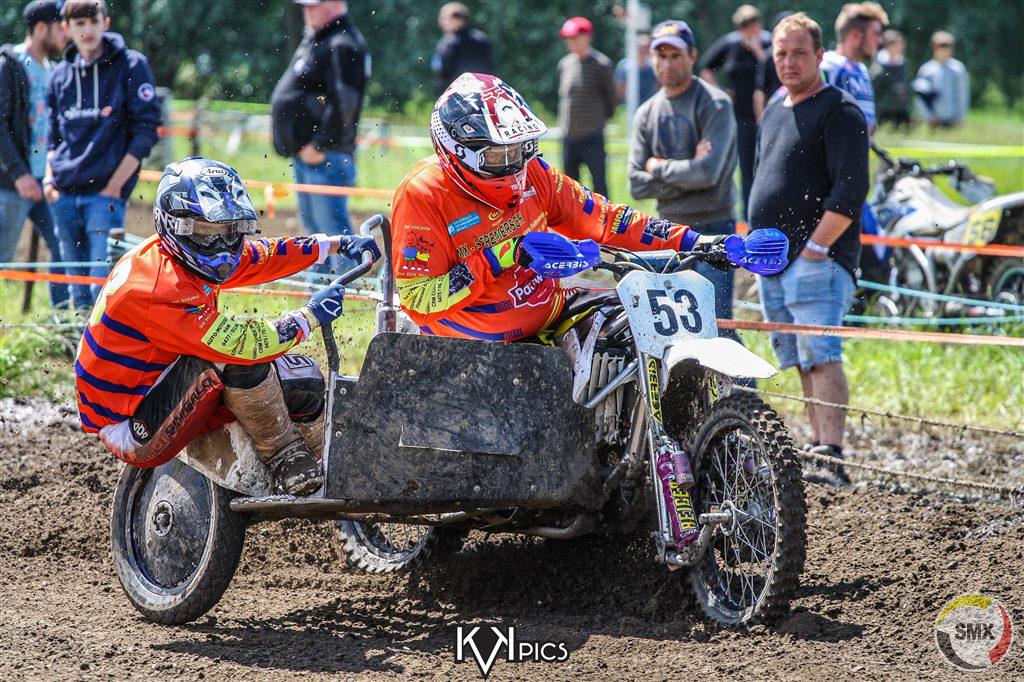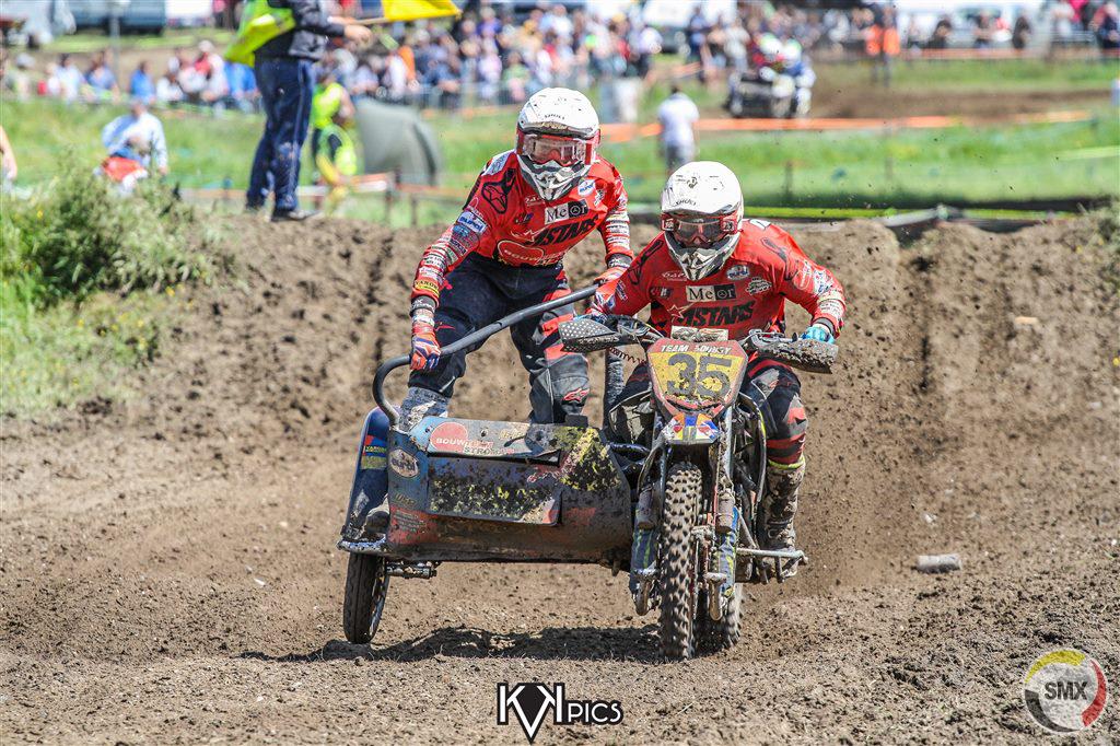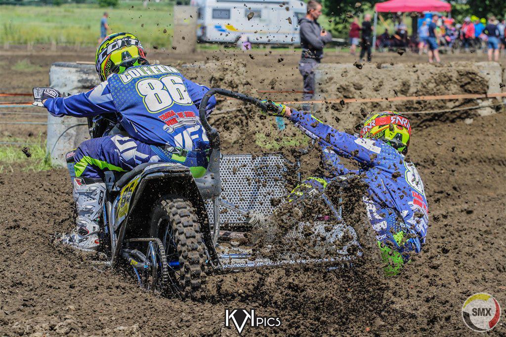 Reeks één was een kolfje naar de hand van de regerende kampioenen Bert Soetaert-Gianni Dhondt , die de handen vol hadden met Sven Siongers-Niels Wisselink die op karakter tweede werden. Kelly Debruyne-Jens Mans, komend van de tweede startrij, wonnen het spurtje om plek drie van Yens Delmotte-Tom Verbrugghe. Maxime van der Haeghen en Frederic Van der Voorden waren als vijfde eveneens in de spits van de wedstrijd te vinden, vlak voor Dylan Boussy-Steve de Schacht die onderweg een tweetal keer tot stilstand kwamen. Jan Ampe en Nzelo Hoste werden sterkste B-rijders op plaats tien. Sven Verbrugge, Ruben Galle, Daen Valcke , Nico de Soete en Kevin Merreel waren de bijzonderste pechvogels van dienst. Laatst genoemden zouden in heat twee niet meer aan het starthek verschijnen. In reeks twee konden kopstarters Boussy-de Schacht en Soetaert-Dhondt zich alras afscheiden van de rest van het peloton. Tot halfkoers klampten Soetaert-Dhondt vlot aan bij koplopers Boussy-de Schacht die er een strak tempo op na hielden en vlot op winst afstevenden. Bert Soetaert, met de zekere eindzege op zak, nam de tweede koershelft geen risico’s meer en koos op plaats twee eieren voor zijn geld. Kelly Debruyne had het opnieuw aan de stok met Yens Delmotte en in de aanvangsfase ook met Sven Siongers, omtrent plaats drie. Debruyne & Mans lieten zien de afgelopen maanden flink wat aan wedstrijdsnelheid te hebben opgebouwd en La Debruyne stond op drie flink haar mannetje en gaf haar plek niet meer af. Delmotte werd vierde, voor eerste B-rijders Valcke-de Veene die door een crash in heat één het dagpodium aan zich zagen voorbij gaan. De B-rijders beten overigens flink van zich af, want met Ampe-Hoste (dagwinnaars) op zes, de broers Moenaert op zeven en het damesduo Van Troys-De Soete op acht was het al B-geluid wat de klok sloeg. In de A-klasse waren de zegebloemen dus voor bijna thuisrijders Soetaert-Dhondt , met Kelly Debruyne en Jens Mans op twee. Derde man en ex MCLB-kampioen Dylan Boussy liet vooral in heat twee zien dat de samenwerking met Steve de Schacht in stijgende lijn gaat en het nieuwbakken koppel het hoogstwaarschijnlijk voor elkaar krijgt om zich klaar te stomen voor de Grand Prix van Markelo binnen drie weken. In de B-klasse hebben Jan Ampe en Nzelo Hoste de goeie flow beet, en zijn de jongste weken niet meer van het podium weg te slaan. Ampe en Hoste wonnen in Tielt, voor de broers Moenaert. Met het organiserende Tieltse meisjesteam Colleen van Troys en Jitske de Soete op plek drie werd ook in de B-klasse aangetoond dat zijspancrossen niet enkel en alleen meer een mannen aangelegenheid is. Onze Kay was uiteraard weer van de partij en keerde huiswaarts met een XXL zijspanfotogalerij van Tielt. Volgende week blijft MCLB in de provincie West-Vlaanderen en trekt naar Oostkamp.