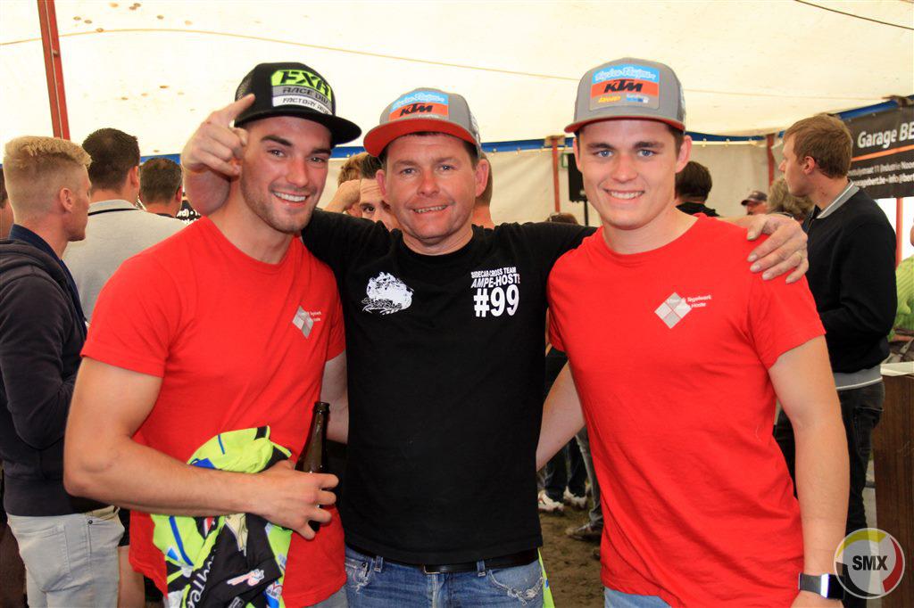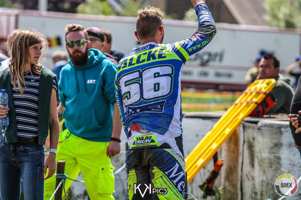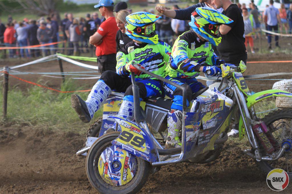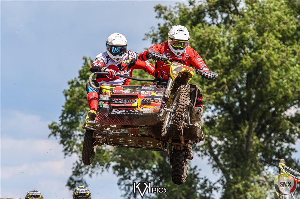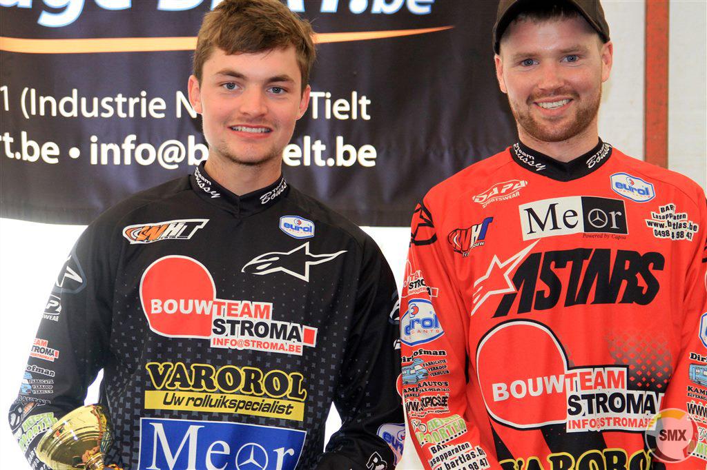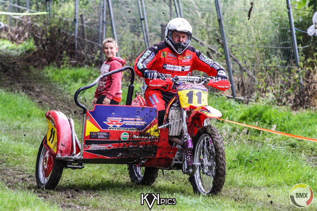 Reeks één was een kolfje naar de hand van de regerende kampioenen Bert Soetaert-Gianni Dhondt , die de handen vol hadden met Sven Siongers-Niels Wisselink die op karakter tweede werden. Kelly Debruyne-Jens Mans, komend van de tweede startrij, wonnen het spurtje om plek drie van Yens Delmotte-Tom Verbrugghe. Maxime van der Haeghen en Frederic Van der Voorden waren als vijfde eveneens in de spits van de wedstrijd te vinden, vlak voor Dylan Boussy-Steve de Schacht die onderweg een tweetal keer tot stilstand kwamen. Jan Ampe en Nzelo Hoste werden sterkste B-rijders op plaats tien. Sven Verbrugge, Ruben Galle, Daen Valcke , Nico de Soete en Kevin Merreel waren de bijzonderste pechvogels van dienst. Laatst genoemden zouden in heat twee niet meer aan het starthek verschijnen. In reeks twee konden kopstarters Boussy-de Schacht en Soetaert-Dhondt zich alras afscheiden van de rest van het peloton. Tot halfkoers klampten Soetaert-Dhondt vlot aan bij koplopers Boussy-de Schacht die er een strak tempo op na hielden en vlot op winst afstevenden. Bert Soetaert, met de zekere eindzege op zak, nam de tweede koershelft geen risico’s meer en koos op plaats twee eieren voor zijn geld. Kelly Debruyne had het opnieuw aan de stok met Yens Delmotte en in de aanvangsfase ook met Sven Siongers, omtrent plaats drie. Debruyne & Mans lieten zien de afgelopen maanden flink wat aan wedstrijdsnelheid te hebben opgebouwd en La Debruyne stond op drie flink haar mannetje en gaf haar plek niet meer af. Delmotte werd vierde, voor eerste B-rijders Valcke-de Veene die door een crash in heat één het dagpodium aan zich zagen voorbij gaan. De B-rijders beten overigens flink van zich af, want met Ampe-Hoste (dagwinnaars) op zes, de broers Moenaert op zeven en het damesduo Van Troys-De Soete op acht was het al B-geluid wat de klok sloeg. In de A-klasse waren de zegebloemen dus voor bijna thuisrijders Soetaert-Dhondt , met Kelly Debruyne en Jens Mans op twee. Derde man en ex MCLB-kampioen Dylan Boussy liet vooral in heat twee zien dat de samenwerking met Steve de Schacht in stijgende lijn gaat en het nieuwbakken koppel het hoogstwaarschijnlijk voor elkaar krijgt om zich klaar te stomen voor de Grand Prix van Markelo binnen drie weken. In de B-klasse hebben Jan Ampe en Nzelo Hoste de goeie flow beet, en zijn de jongste weken niet meer van het podium weg te slaan. Ampe en Hoste wonnen in Tielt, voor de broers Moenaert. Met het organiserende Tieltse meisjesteam Colleen van Troys en Jitske de Soete op plek drie werd ook in de B-klasse aangetoond dat zijspancrossen niet enkel en alleen meer een mannen aangelegenheid is. Onze Kay was uiteraard weer van de partij en keerde huiswaarts met een XXL zijspanfotogalerij van Tielt. Volgende week blijft MCLB in de provincie West-Vlaanderen en trekt naar Oostkamp.