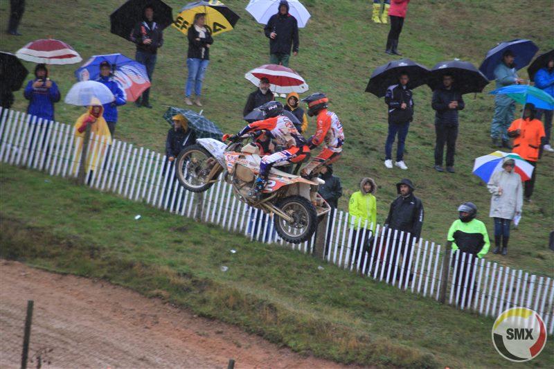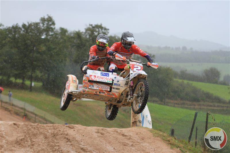 Terwijl het water nog steeds met bakken uit de lucht kwam , ging de tweede manche van start. In erbarmelijke omstandigheden kregen we,net als in reeks één, een verrassende leider : De Zwitsers Heinzer-Betschart wisten met hun links zijspan blijkbaar goed de juiste sporen te vinden en hielden het vier ronden vol vooraan,tot de druk van Veldman-Cermak té groot werd,en de jonge Nederlander met één verre en hoge sprong over het hoofd van de Zwitsers heen naar de koppositie vloog. Veldman nam algauw tien seconden voorsprong,consolideerde daarna en won overtuigend. Marco Heinzer liet voor Zwitserland een belangrijke tweede plaats optekenen. Daarachter woedde een hevig duel om plaats drie,tussen Nederland en België : Keuben-Debruyne verdedigden met hand en tand hun positie, maar Van Daele-Smeuninx beten zich , van kop tot teen onder de modder ,vast aan het achterwiel van de Nederlander en konden na een kwartier de derde plek overnemen.