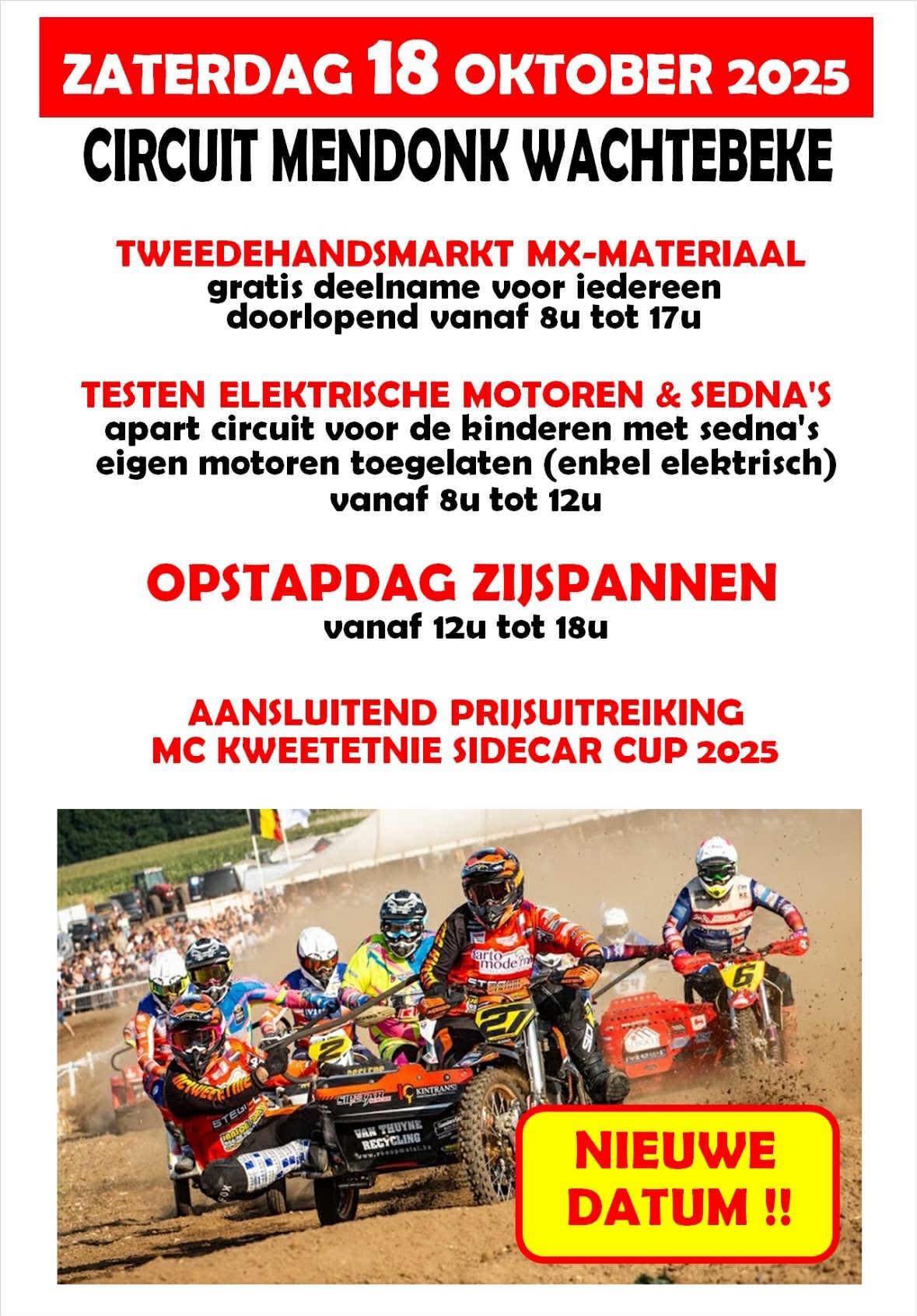 Bij MC Kweetetnie zijn ze niet het soort mensen zijn dat zich rap uit zijn lood laat slaan. Nadat vorig weekend de zijspancross-opstapdag letterlijk en figuurlijk in het water viel, heeft men zich herpakt en is er nu een nieuwe datum gevonden voor de opstapdag : Zaterdag 18 oktober. Programma (met naast de zijspancross opstapdag, ook ruimte voor demo’s voor kids en elektrische motoren, een tweedehands motorcrossmarkt en prijsuitreiking MC Kweetetnie criterium) blijft hetzelfde als aanvankelijk was voorzien.