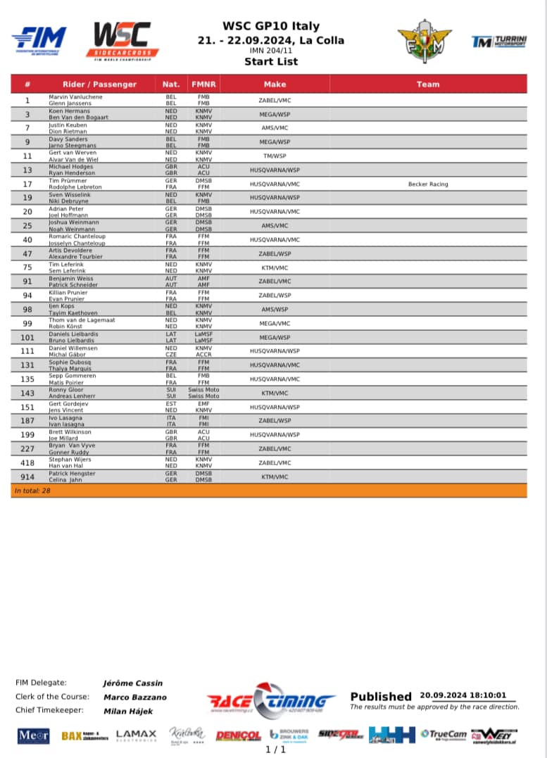Een wondermooie omgeving in de bergen bij de Ligurische Zee, een spectaculair circuit en mooi weer. Wat wil een mens nog meer ? Zijspancross misschien. Dàt zal er vandaag echter niet van komen in La Colla, waar de finale van het WK zijspancross 2024 gepland staat. De organisatie ,die voor de allereerste keer een WK-race organiseert en - letterlijk – bergen werk heeft verzet op en rond hun circuit, kampt nog met wat kinderziektes op allerlei vlak, waardoor FIM op vrijdag plots voor een huizenhoog administratief probleem kwam te staan, en in allerijl een noodscenario moest uitwerken : De Quads (17 rijders aanwezig) rijden hun finale om de Europese titel op zaterdag. De zijspannen rijden hun WK-finale op zondag. Er zijn achtentwintig teams aanwezig in La Colla , waaronder ook de Italiaanse nationale kampioenen Ivo en Ivan Lasagna. Er wordt voor de sidecars op zondagochtend een vrije training en daarna een tijdstraining verreden om de startvolgorde te bepalen. Op zondagmiddag volgen de twee manches om 13:00 uur, en om 16:00 uur zoals tijdens het normale Grand Prix programma,en is de nieuwe wereldkampioen gekend. De startlijst voor de Grand Prix in La Colla vind je bij de gele knop 'Extra'.