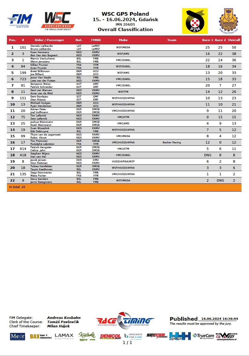 In een zonnig, winderig en kurkdroog Gdansk verschenen slechts drieëntwintig equipes voor de kwalificaties van de vijfde WK-race van het seizoen 2024.Er werd flink gesproeid om het stof onder controle te houden. In groep A gingen ze met zijn twaalven op pad, waarvan Hodges-Henderson verrassend helemaal van buitenaf de holeshot afsnoepten van de verbouwereerde Franse broers Prunier. Lielbardis en Leferink konden in de eerste ronde nog de onwennige Engelse leider terug wijzen. Ook Wijers-van Hal kwamen goed weg, maar zakten in de aanvangsfase wat terug naar plek zes. De Pruniers kwamen uiteindelijk als achtste uit de eerste bocht. Weinmann en Van Werven haakten in mekaar en kwamen tot stilstand in de openingsfase. Vooraan reden de Lielbardis-boys vlotjes weg van de broers Leferink die op plek twee eveneens weinig tegenstand kenden . Enkel in de slotfase kwamen de teruggekeerde broers Prunier op plek drie,nog even kijken naar het achterwiel van Leferink. Daarna was het even wachten op Wilkinson-Millard, en Wijers-van Hal die beiden een eenzame race besloten op plaatsen vier en vijf.