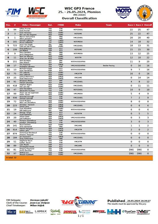 Om exact vier uur viel het starthek voor de beslissende wedstrijd van de dag.De Prunier broers kozen net als in reeks één, en tegen alle logica in, volledig de buitenste startplaats, maar dat leverde hen wel de holeshot op. Prümmer-Lebreton , Van Daele-vd Putten,Vanluchene-Janssens en de broers Lielbardis waren de naaste achtervolgers. Niet de eersten de besten dus,maar daar waren de Pruniers allerminst van onder de indruk. Hermans-vd Bogaart waren in de tweede bocht wat in de verdrukking geraakt en lagen na een halve ronde op plek negen. De Fransen begonnen vooraan meteen, onder luid gejoel van de enthousiaste Franse toeschouwers, aan het uitbouwen van een mooie voorsprong die na vijf ronden,toen Vanluchene-Janssens konden doorstoten naar plek twee, al tien seconden bedroeg. De Belgen kregen het gat met de koplopers echter niet gedicht , integendeel. Toen halfkoers ook Hermans-vd Bogaart waren opgerukt naar voor , werd de druk zo hoog opgevoerd dat Vanluchene ook zijn tweede plaats moest afgeven aan de Nederlanders,die meteen weg reden,maar niet meer bij de dolgelukkige winnaars Killian en Evan Prunier geraakten.